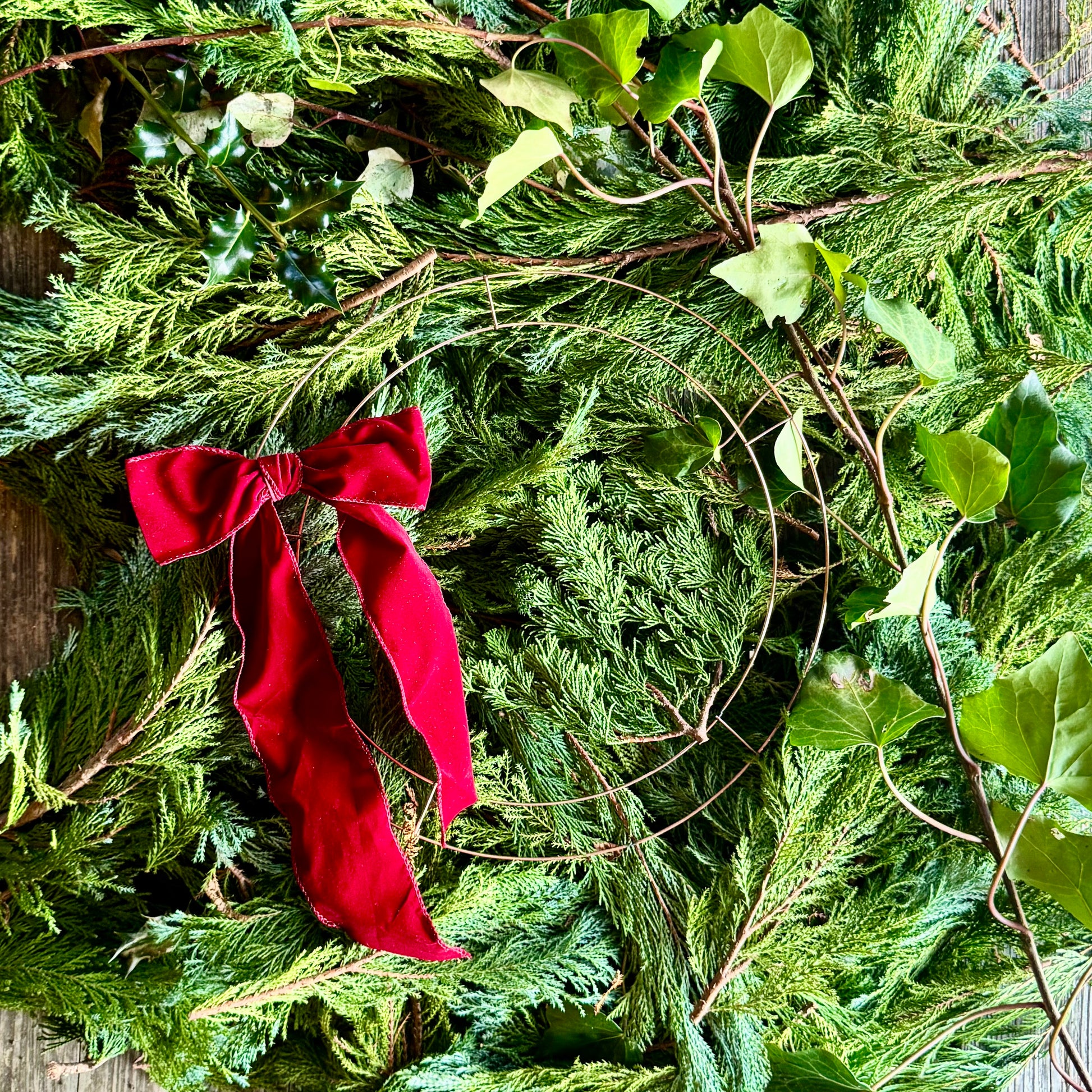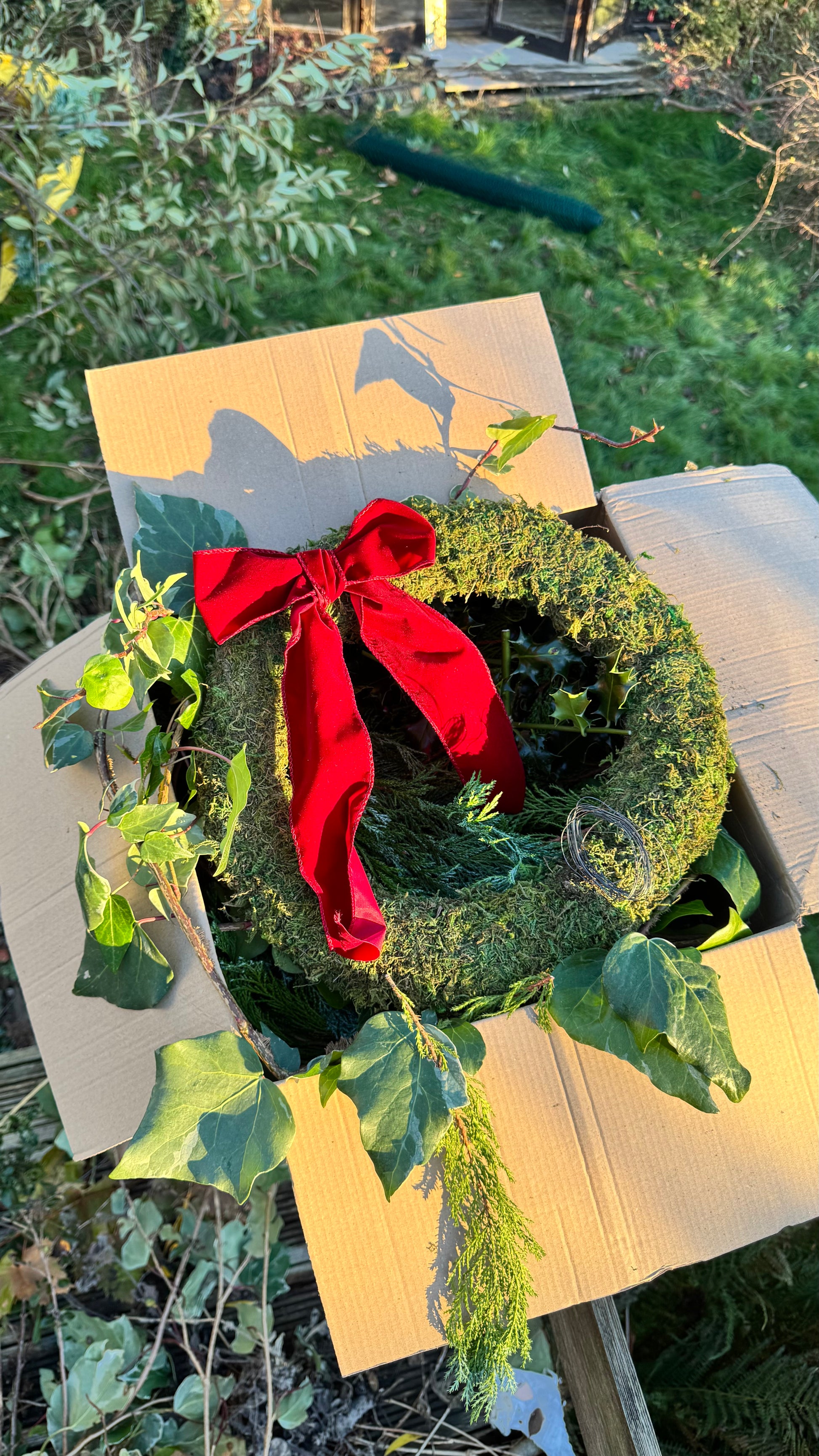 A fresh, hand-cut DIY Christmas wreath kit from our cottage garden in Burton, with an optional premium moss ring upgrade.