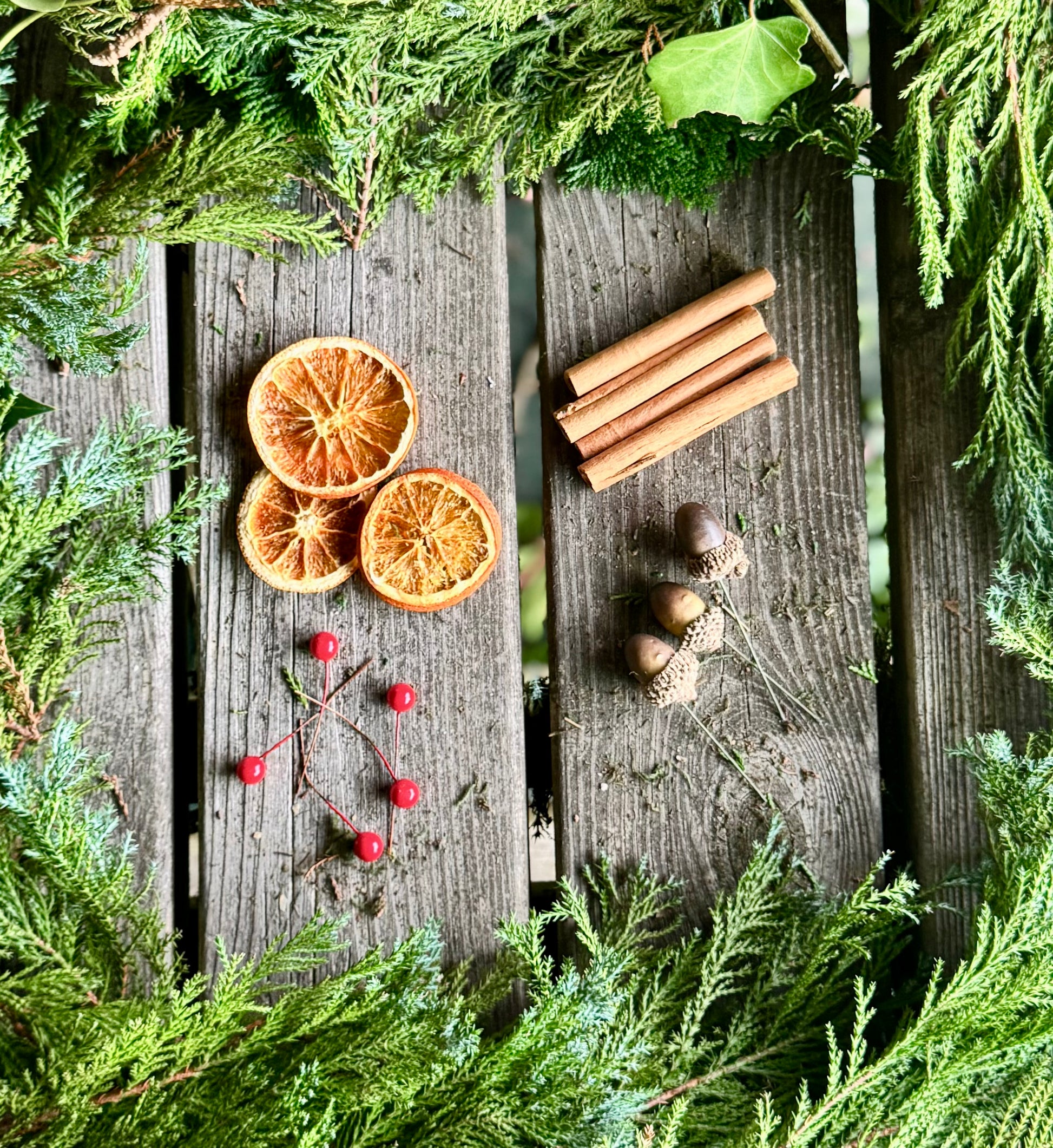 Our foliage is grown without chemicals and cut responsibly. Packaging is minimal and recyclable. Foliage and decorations are fully compostable after the season, and the wire ring can be reused next year.